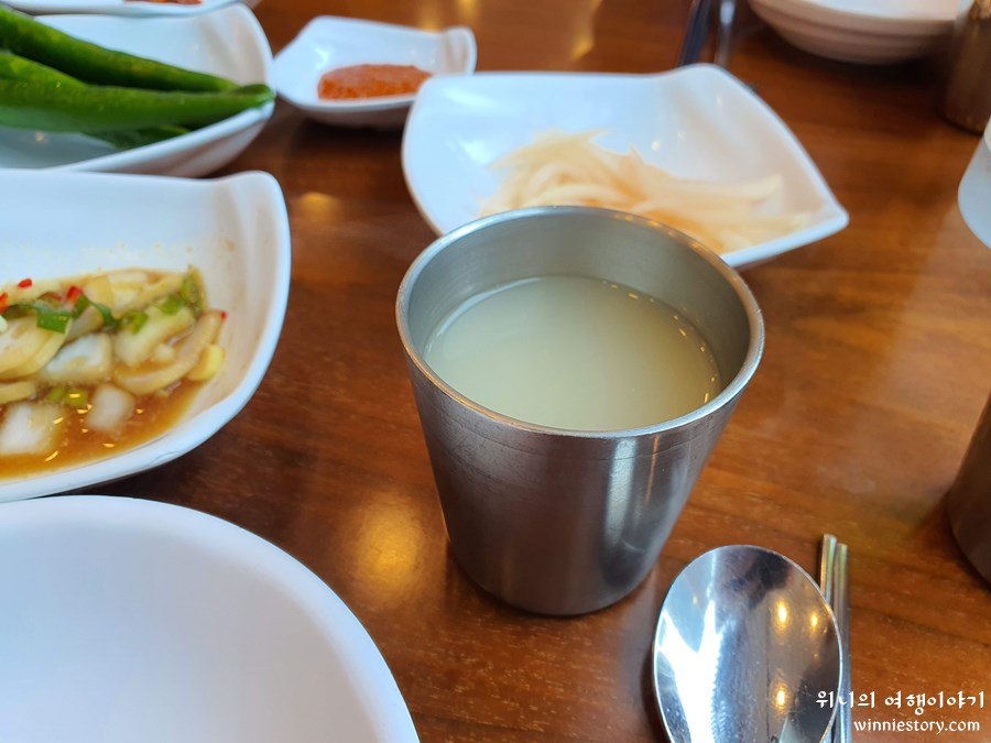 냉면 먹기 전에 밑반찬하고 따뜻한 육수가 나왔다.