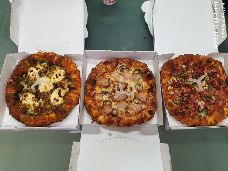 3명이서 시켜서 나눴는데 왼쪽부터 레전드, 베이컨 체다 할라피뇨, 페퍼로니 딜라이트다.