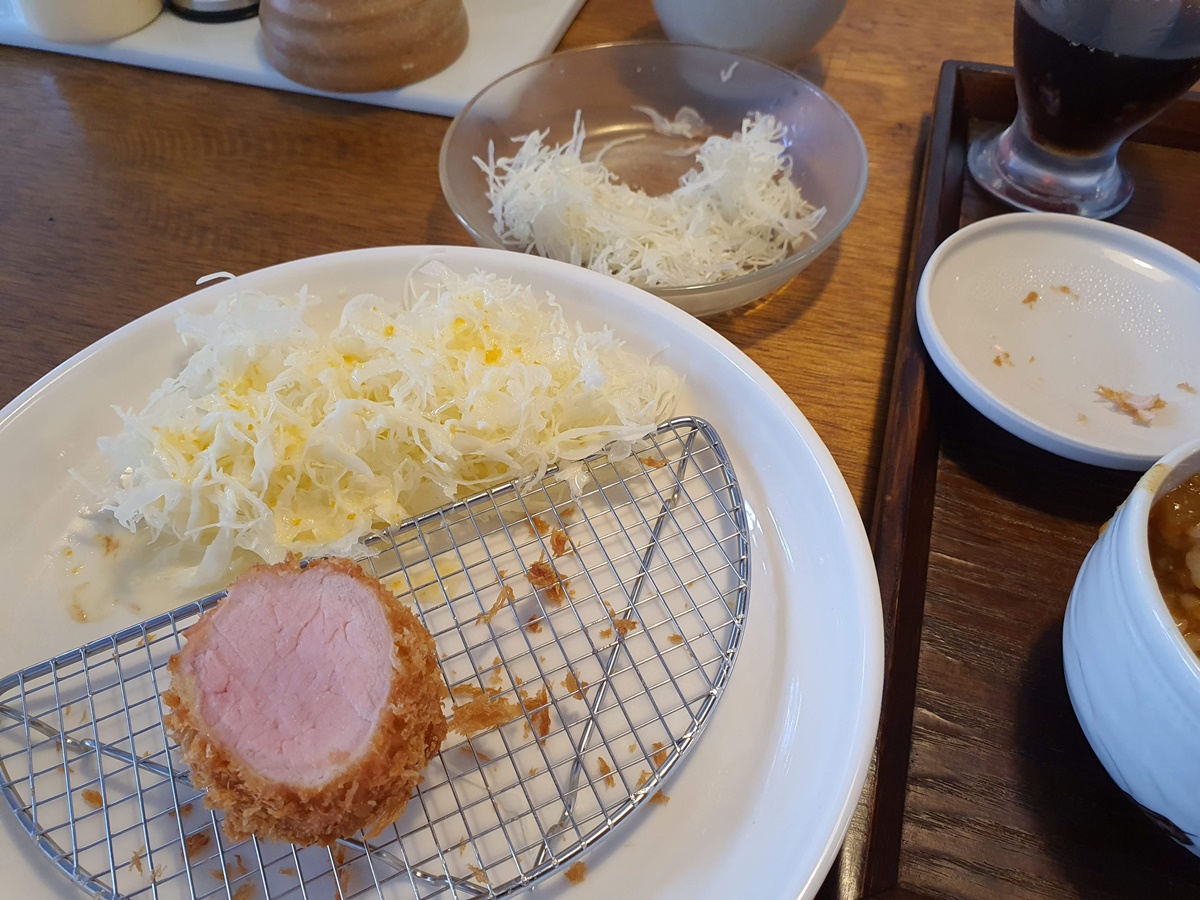 돈까스 굽기는 기본적으로 미디엄웰던으로 나온다고 한다. 미디엄하고 웰던 사이니까 완전 익은건 아니라서 핏기가 보이는 것 같지만 사실 먹는데 문제는 없다.