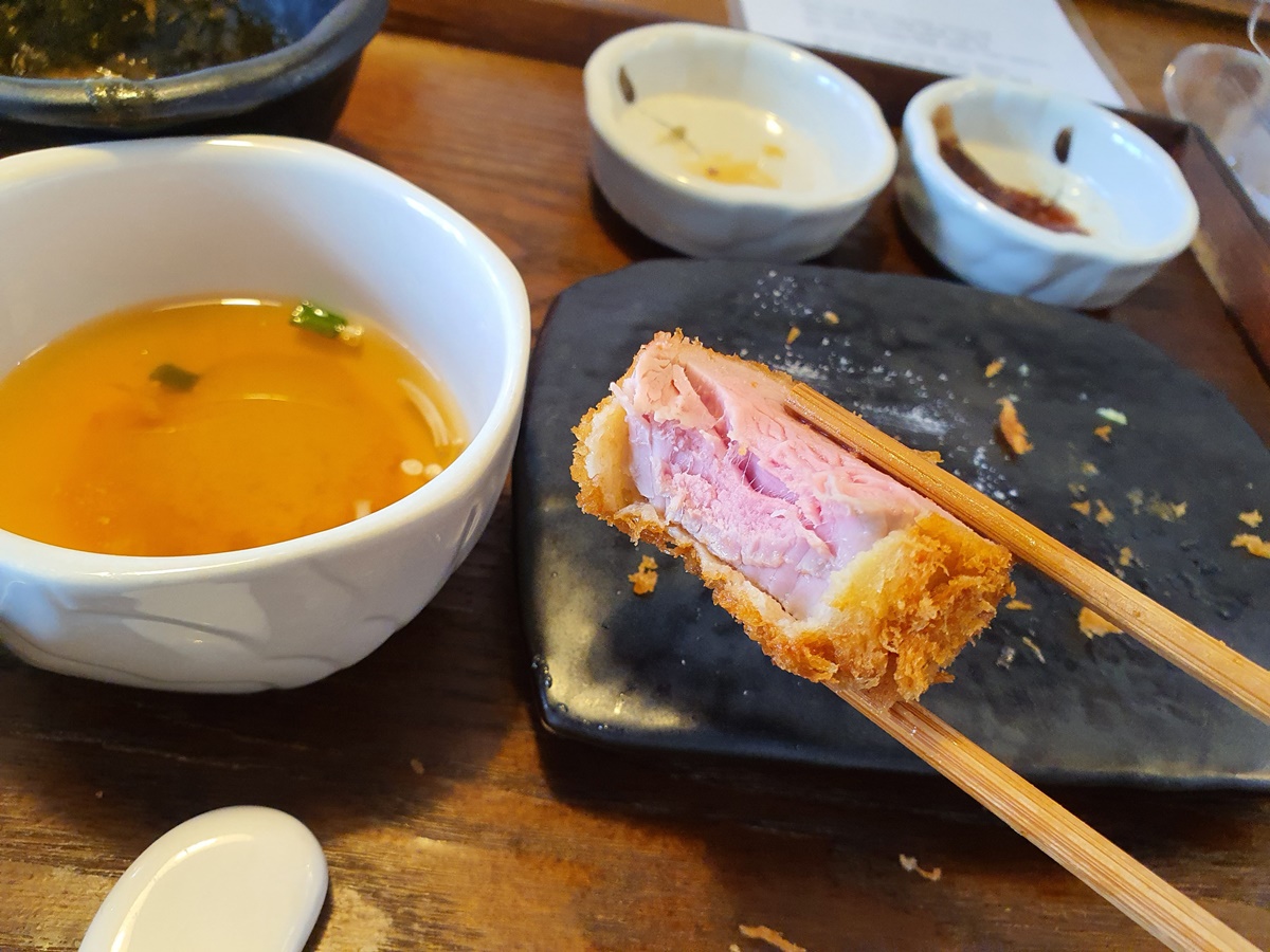 돈까스 굽기는 기본적으로 미디엄웰던으로 나온다고 한다. 미디엄하고 웰던 사이니까 완전 익은건 아니라서 핏기가 보이는 것 같지만 사실 먹는데 문제는 없다.