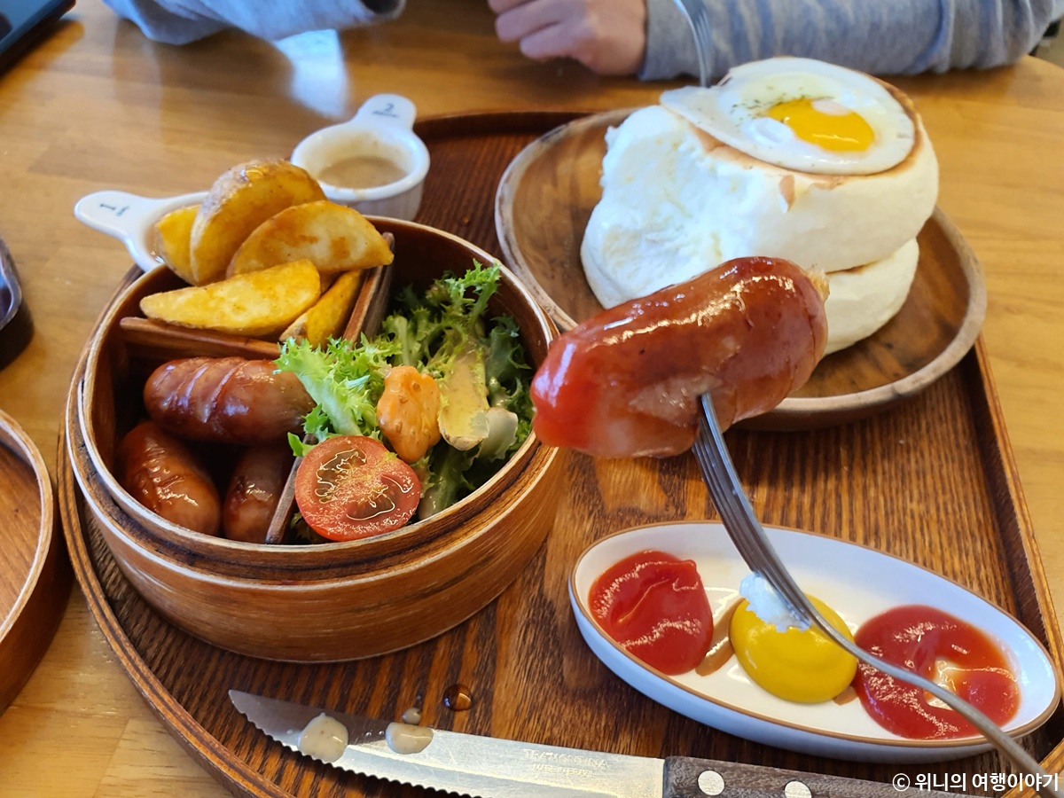 결국 수플레케이크는 끝까지 못 먹을거 같아서 남겼고 옆에 같이 나오는 샐러드랑 소시지, 감자튀김은 열심히 먹었다.
