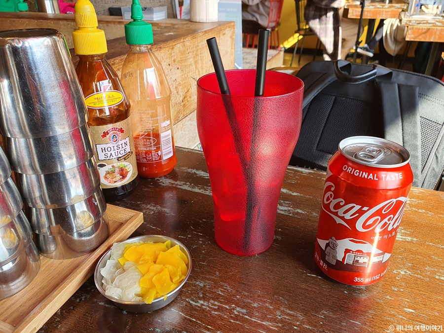쌀국수도 파는 곳이라 그런가 테이블 마다 해선장소스하고 스리라차 소스가 진열되어있다.