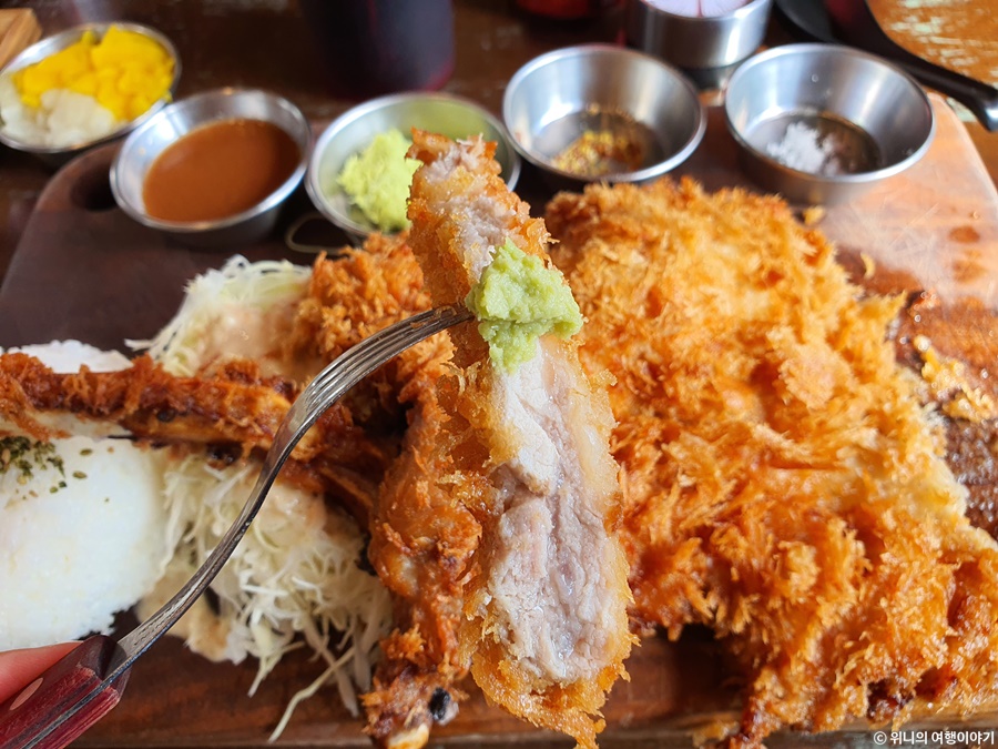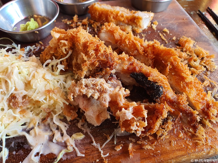 돈까스 속에도 제대로 익었고 와사비 하나 얹어서 바로 먹어본다.