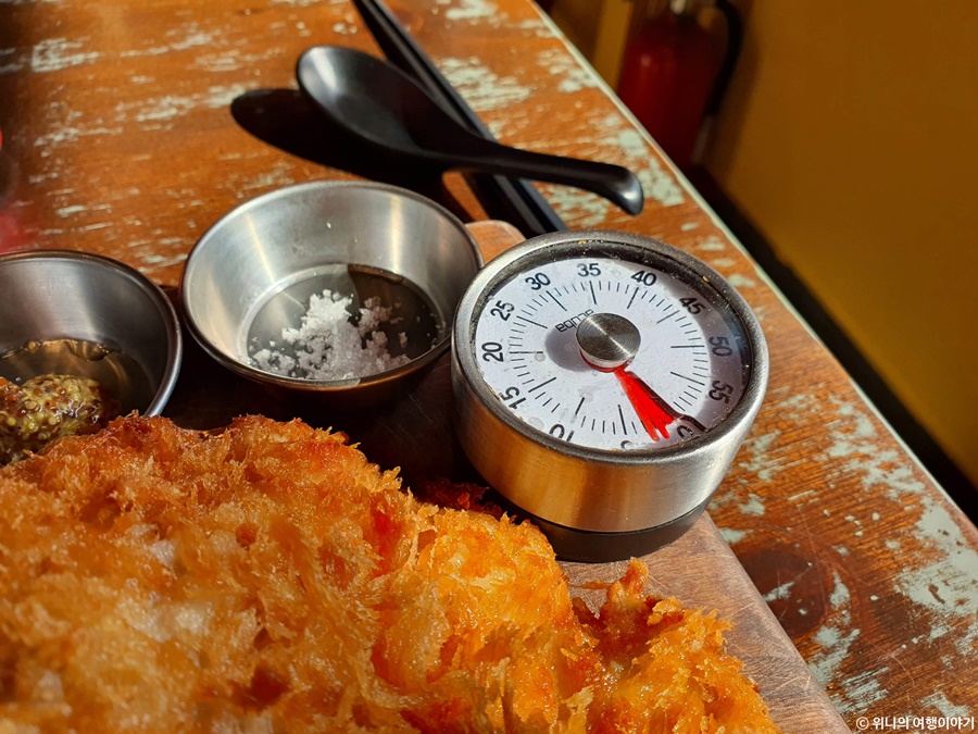 특이하게 돈까스가 나오고 나서 래스팅 되는 시간 기다리라고 타이머가 있더라. 한 3분 정도로 맞춰져있는 듯 하다.
