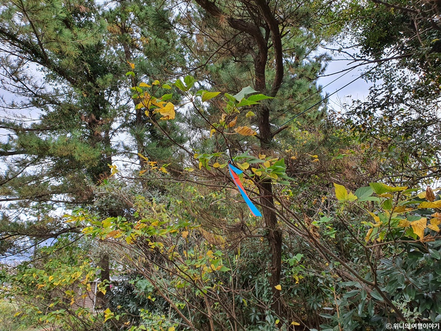 나는 몰랐는데 여자 친구가 나뭇가지에 걸려있는 주황색과 파란색 표식을 가리키면서 저게 올레길 안내표식이라고 알려주더라.