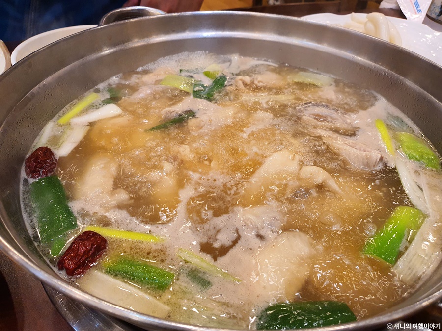 그리고 우리 테이블로 나온 닭한마리. 일단 테이블에 나온 상태에서 좀 더 끓고 나서 먹어야 한다.