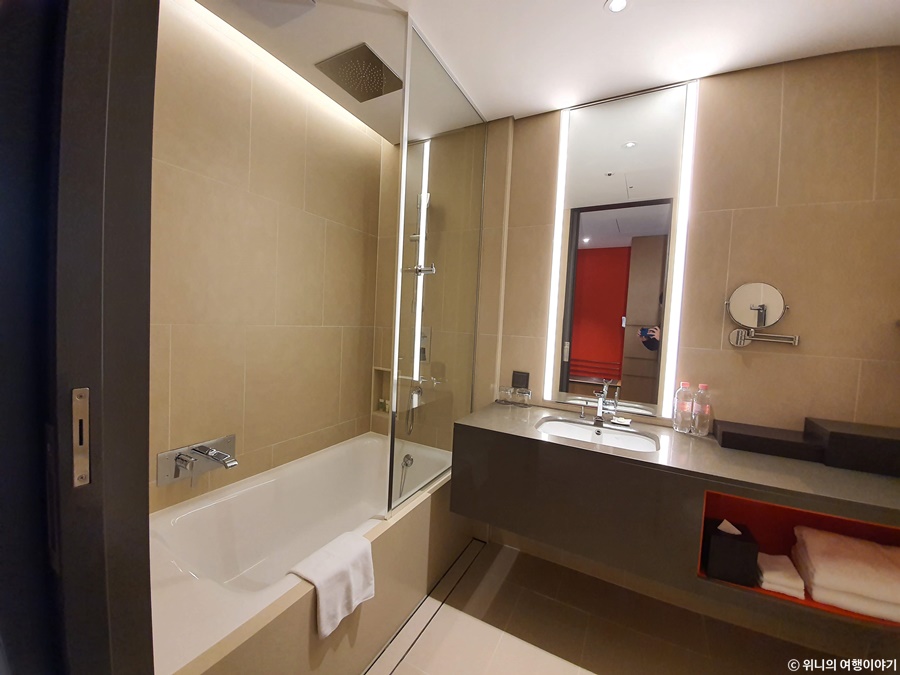 호텔 욕실 대부분이 그렇 듯이 미닫이 문을 설치해놓고 전체적으로 깔끔하게 만들어 놓은 편.