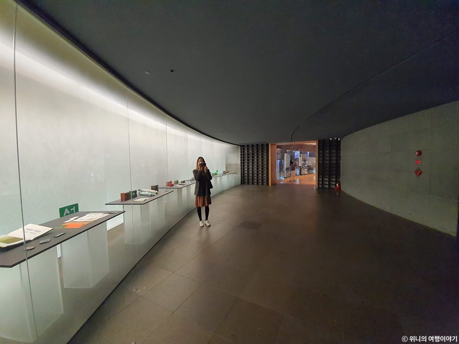 격자로 짜여진 전시대와 천장 마감이 눈에 들어온다.