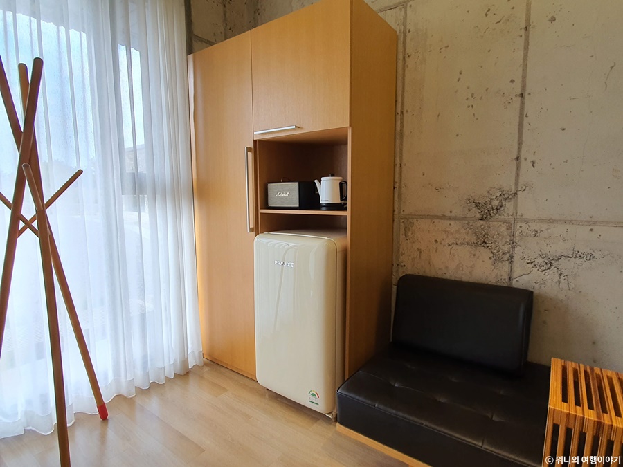 입구쪽에는 마샬 스피커랑 커피포트, 그리고 냉장고가 있었다.