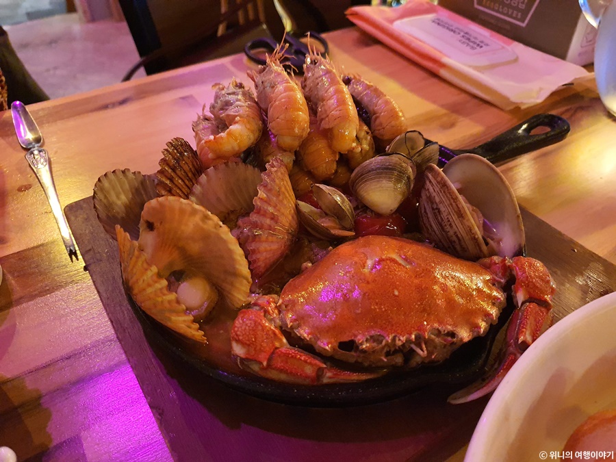 흔히 감바스에 새우를 넣어서 하는데 여기는 딱새우를 사용했고, 그 외에도 게나 조개들이 한가득이다.