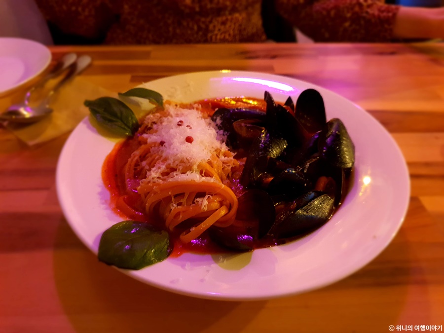 토마토 파스타에 홍합이 잔뜩 쌓여나온다.
