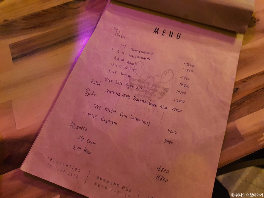 금능태왁은 일반 기본적으로 파스타 메뉴가 있다.