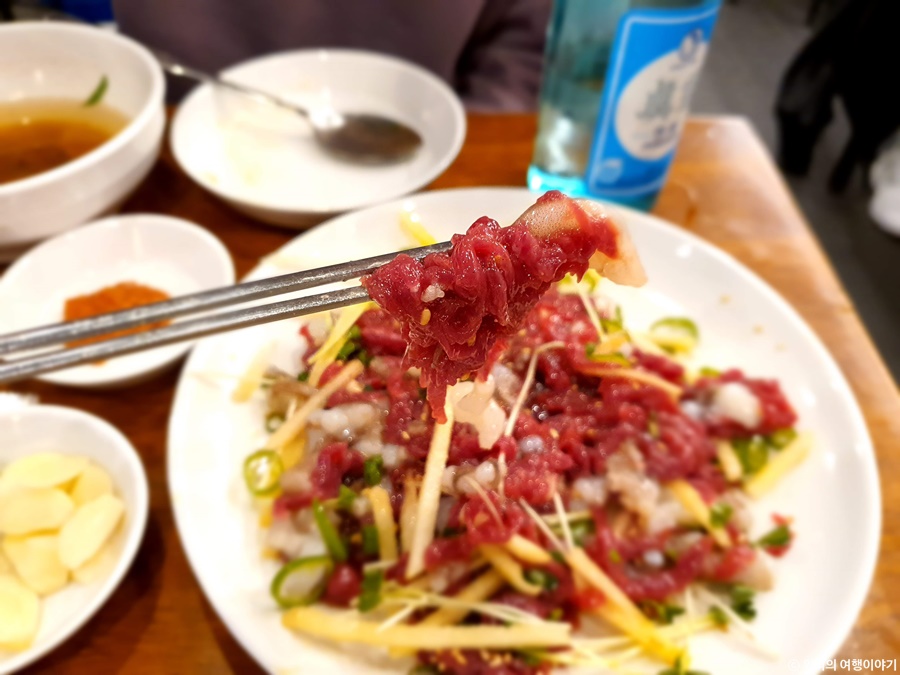 역시나 육회 먹을 때 소주가 빠질 수 없다. 소주 한 두잔 마시니 육회가 더 잘 들어간다.