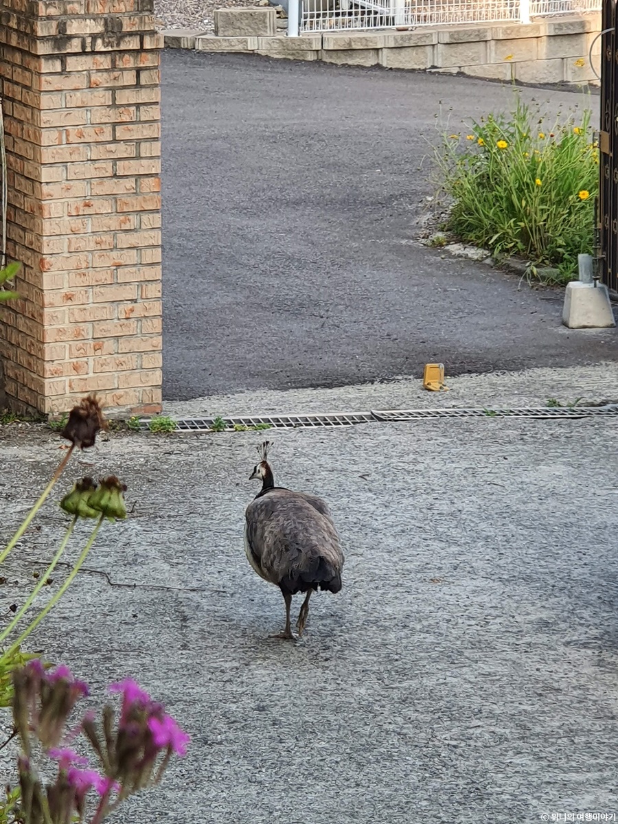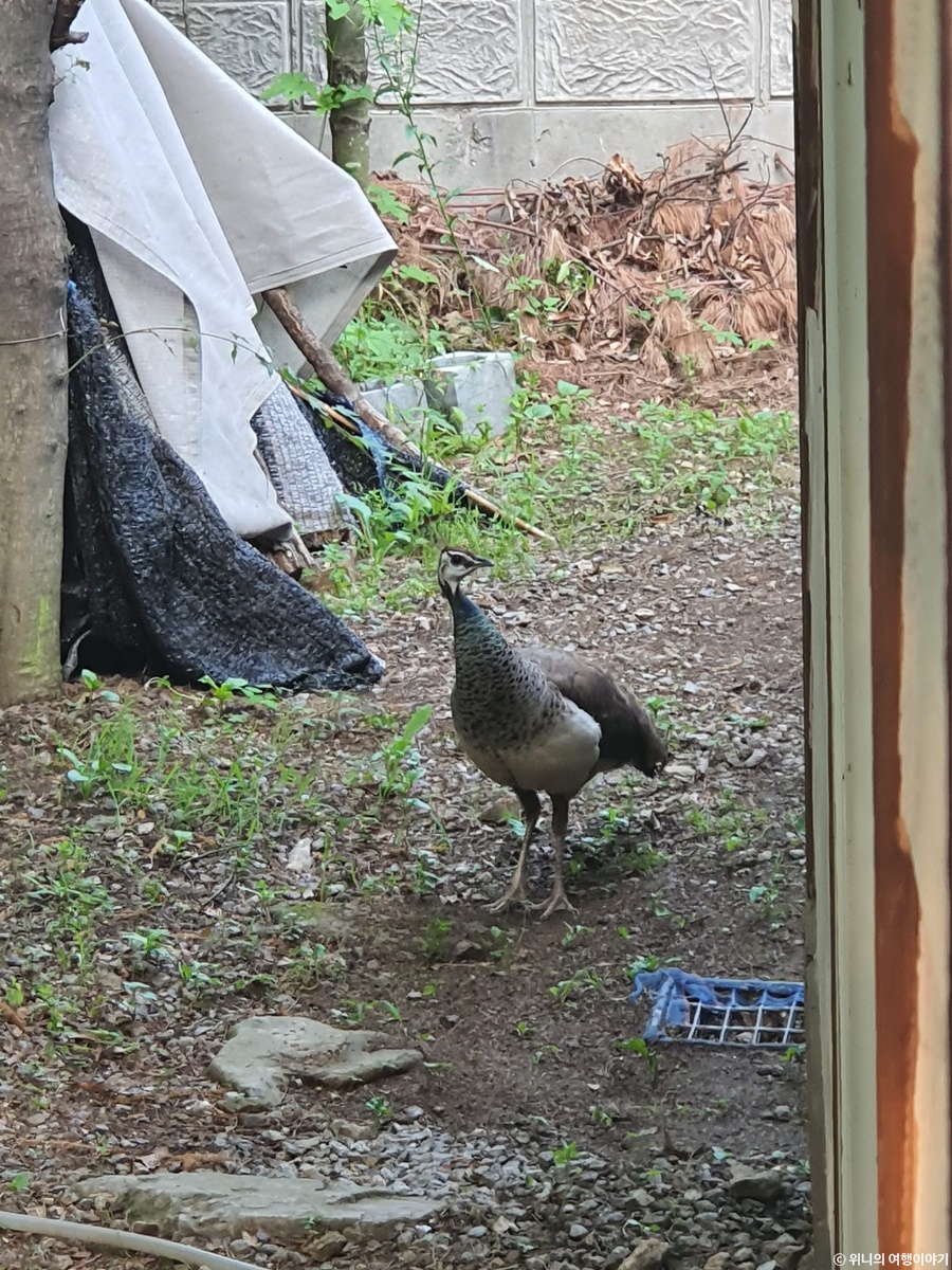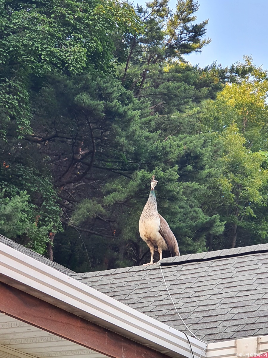 아무래도 야생 공작은 아닌 듯 하고, 주변 어디 농장이라든지 키우는 곳에서 도망친거 같은데.. 아주 자기 집인것 마냥 집 구석구석을 구경하며 다녔다.