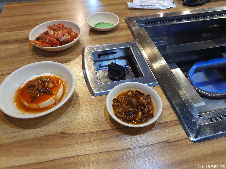 기본찬으로 두부하고 번데기가 나온다.