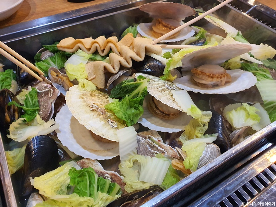 가리비찜이 담긴 통이 열리는데 열기가 팍 나오면서 가리비, 홍합, 오뎅, 야채 등등 갖가기 재료들이 자태를 뽐내기 시작. 이럴 때 소주가 빠질 수 없다. 바로 한 병 시키게 된다.
