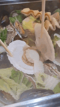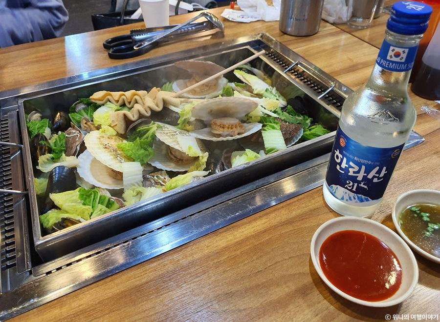 가리비찜이 담긴 통이 열리는데 열기가 팍 나오면서 가리비, 홍합, 오뎅, 야채 등등 갖가기 재료들이 자태를 뽐내기 시작. 이럴 때 소주가 빠질 수 없다. 바로 한 병 시키게 된다.