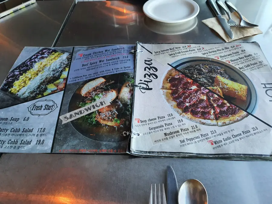 후배님이 도착하고 나서 메뉴판을 보며 무엇을 시킬지 고민하다가 아무래도 시그니쳐라고 하는 콥 샐러드를 하나 골랐고, 피자 중에서는 그나마 무난할 듯 한 페퍼로니 피자를 시켰다.