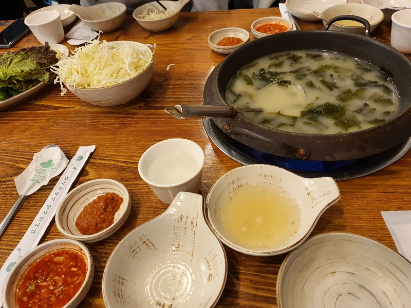 오향가는 기본 세팅에 반찬이라 할만 한 것은 없고, 상추하고 고추, 마늘 같은 쌈채소하고 양배추, 그리고 미역국이 나온다. 미역국도 술 마시기전에 간단하게 위를 코팅하기에는 괜찮았던 것 같다.