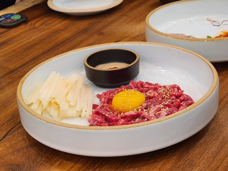 땅콩 베이스 소스에 배와 함께 육회를 찍어먹으니 고소하면서 씹는 맛, 고기 맛도 좋았다.