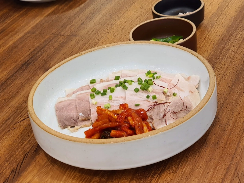 한돈 냉제육이란다. 아마 2개를 나눠서 시켰는데 한 개는 한참을 안 나와서 그냥 취소 하고 나갈까 할 때 즈음 나와서 먹었다. 같이 나오는 녀석과 함께 먹으면 맛있다.