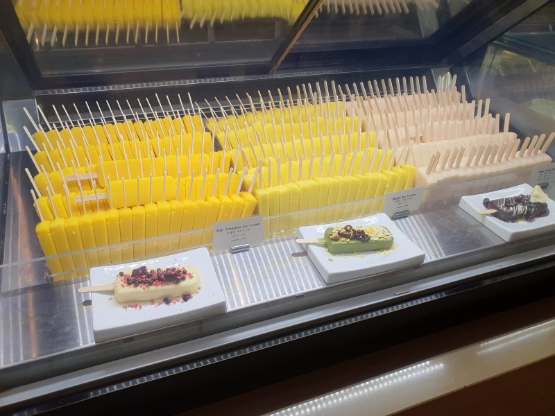 왼쪽부터 천혜향, 모히토, 백도 아이스크림이었는데, 저 아이스크림 베이스에 원하는 초코릿을 묻히고 그 위에 내가 원하는 토핑을 골라서 먹을 수 있었다. 이건 마무리로 딱 먹기로 했다.
