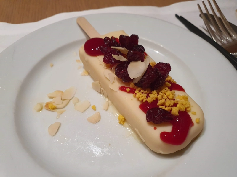 천혜향 아이스크림을 화이트 초콜릿으로 덮고 나서 그 위에 라즈베리 잼하고 아몬드, 그러고 크런치까지 올려서 가져왔다.