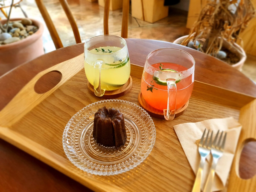 제주청귤티랑 히비스커스자몽티. 그리고 까눌레도 하나 시켰다. 녹차 까눌레가 있더라.