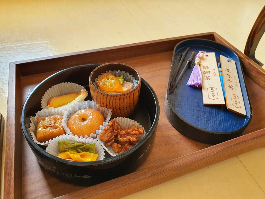 다과에 대해서도 간단히 설명해주시는데 또 다른 나무 통에 담겨있는건 구선왕도고로 약초를 섞은 떡인데, 세종대왕이 즐겨드셨다고 한다.