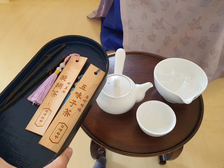 날이 덥기도 하고 늦어서 좀 뛰기도 해서 그런가 따뜻한 차는 마시기 좀 부담스럽고 내가 원래 좋아하던 오미자차를 시키고 와이프는 제호차를 시켰다.
