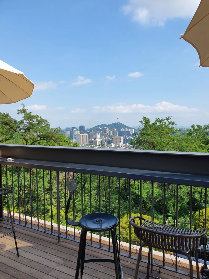 2층 테라스에서 바라본 뷰. 멀리 남산타워(서울N타워)가 보인다. 산 중턱에 위치하고 있고 기존의 초소라는 장소성 때문인지 이곳에서 서울 시내 조망이 시원하게 보인다.