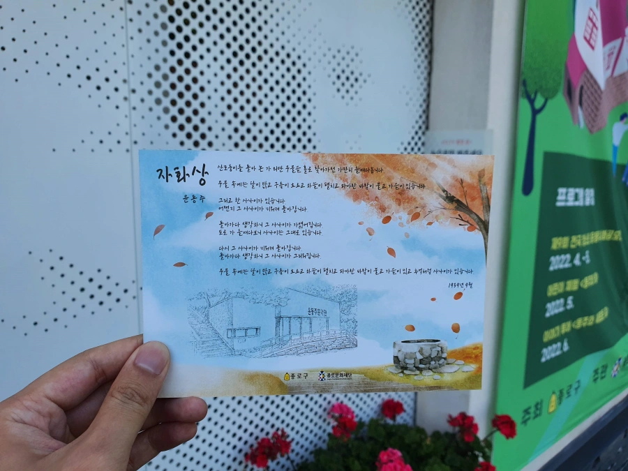 안에 안내해주시는 직원분이 지금 스탬프 이벤트를 하고 있다고 윤동주 자화상이 적혀있는 엽서에 직접 스탬프를 하나 이쁘게 찍어주셨다. 이렇게 또 기념품을 하나 만들어 간다.