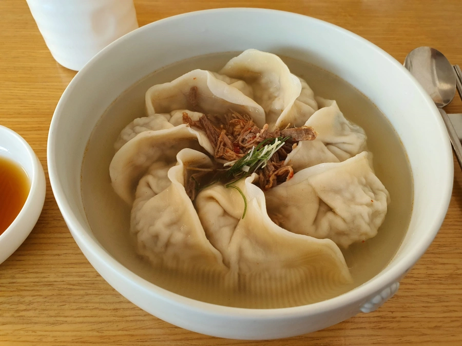 만둣국에 만두는 7개가 아주 정갈하게 들어가있다. 그 위에는 손으로 찢은 소고기 양지가 올라가있다.