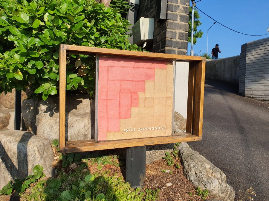 밑 바탕은 천으로 뜬건지 뭔지 영어로 자하 손만두라고 적혀있는 입간판이 하나 서있다.