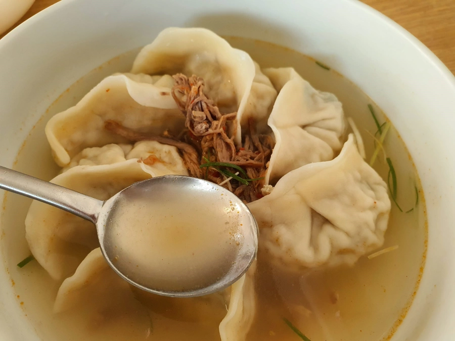 만둣국에 만두는 7개가 아주 정갈하게 들어가있다. 그 위에는 손으로 찢은 소고기 양지가 올라가있다.
