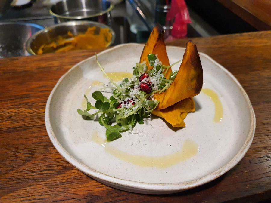 단호박 퓨레 위에 구운 단호박 올라가있고 거기에 샐러드.