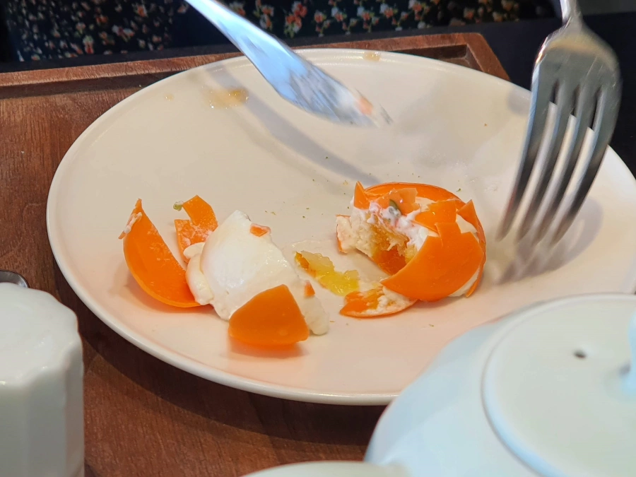 감귤 봉봉 쇼콜라라고 한입에 먹으면 봉봉 초콜릿처럼 팍! 하고 액상이 터지는 디저트였는데 와이프는 단면을 보고 싶다며 반으로 가르고 나서 뭔가 먹기 이상해졌다며 후회하더라.