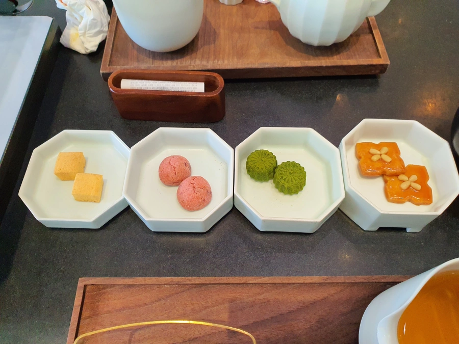 다식 한상이라고 4가지 소담한 차과자인데, 다식 모양인데 뭔가 우리가 생각하는 다식이 아닌 그런 반전 느낌? 의 디저트라고 한다.