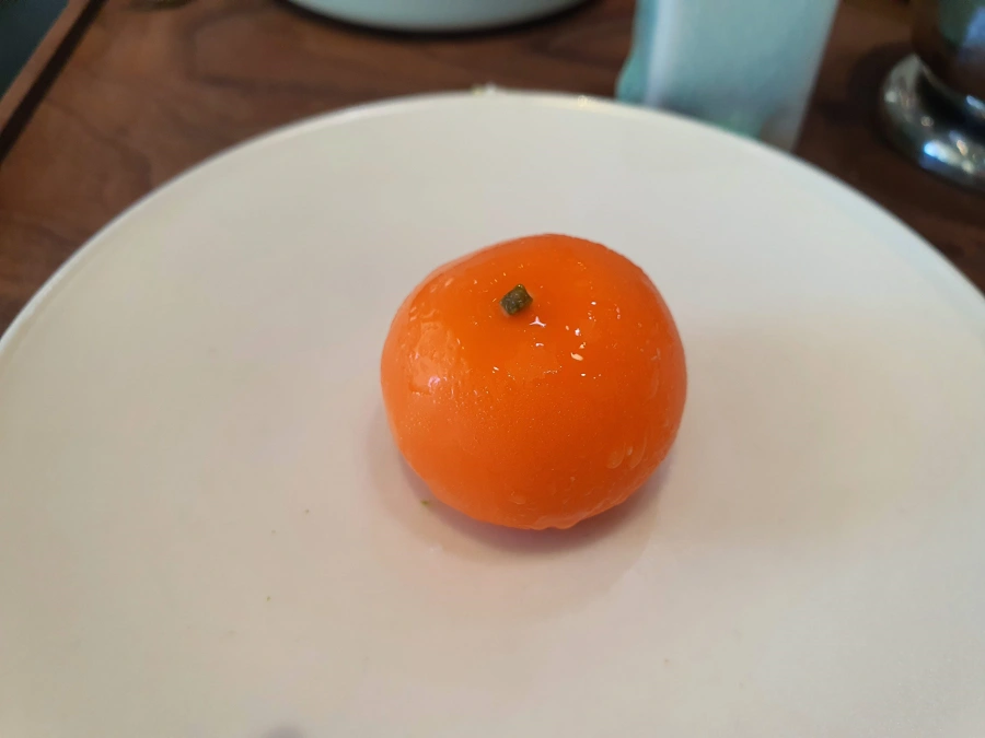감귤 봉봉 쇼콜라라고 한입에 먹으면 봉봉 초콜릿처럼 팍! 하고 액상이 터지는 디저트였는데 와이프는 단면을 보고 싶다며 반으로 가르고 나서 뭔가 먹기 이상해졌다며 후회하더라.