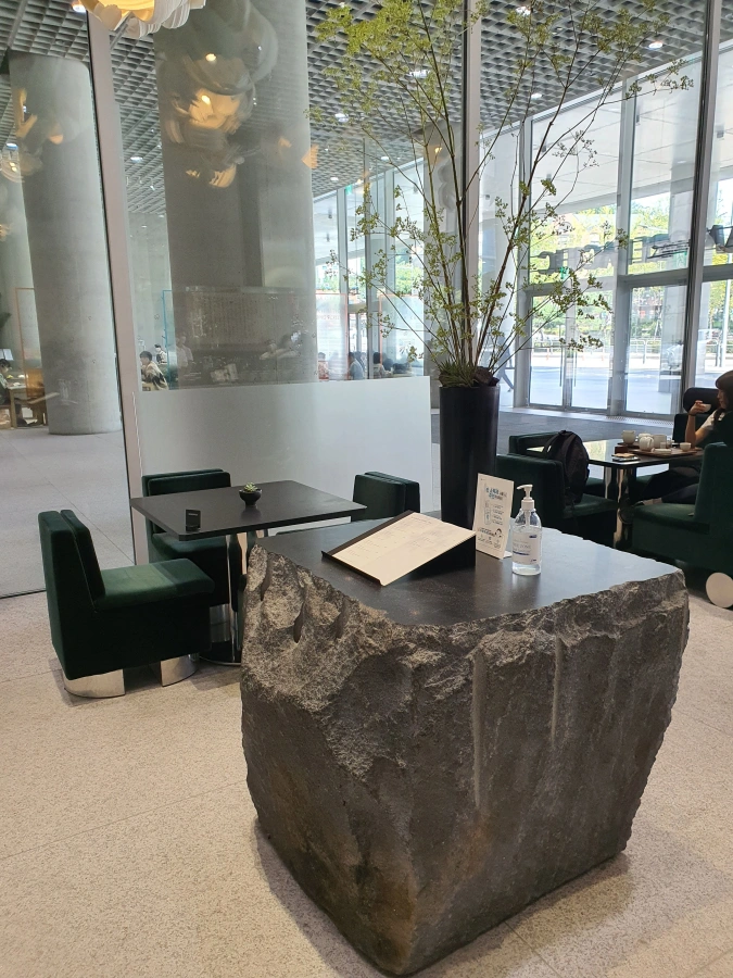 아모레퍼시픽 본사 자체의 인테리어가 노출 콘크리트를 주 컨셉으로 잡고 있어서 그런가 전체적인 바닥재나 천장재, 톤이 그와 비슷한 모노톤 이었고 의자에 포인트를 줬더라.