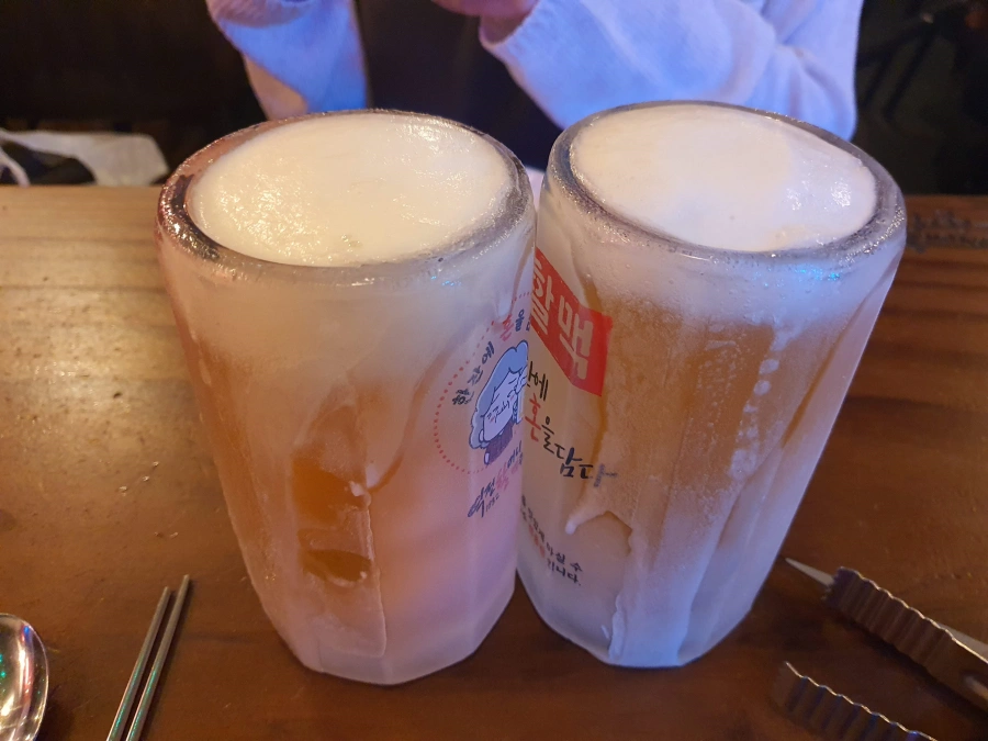 역전할머니맥주 하면 얼어있는 잔이 생각난다.