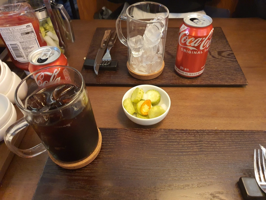 서빙 돼서 나오는 얼음잔하고 밑에 컵받침하고도 딱 맞았는데 저 컵의 용량이 콜라 하나를 그냥 가득 따랐을 때 진짜 딱 맞더라. 얼음의 양까지 정확하게 계산된 잔이라고 해야하나..