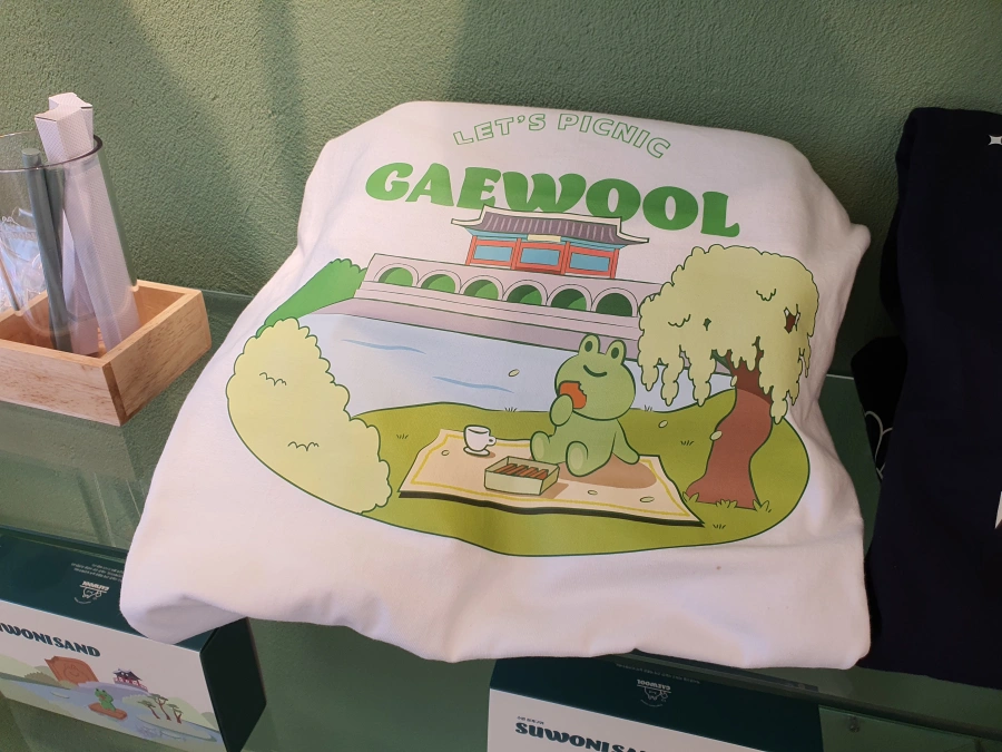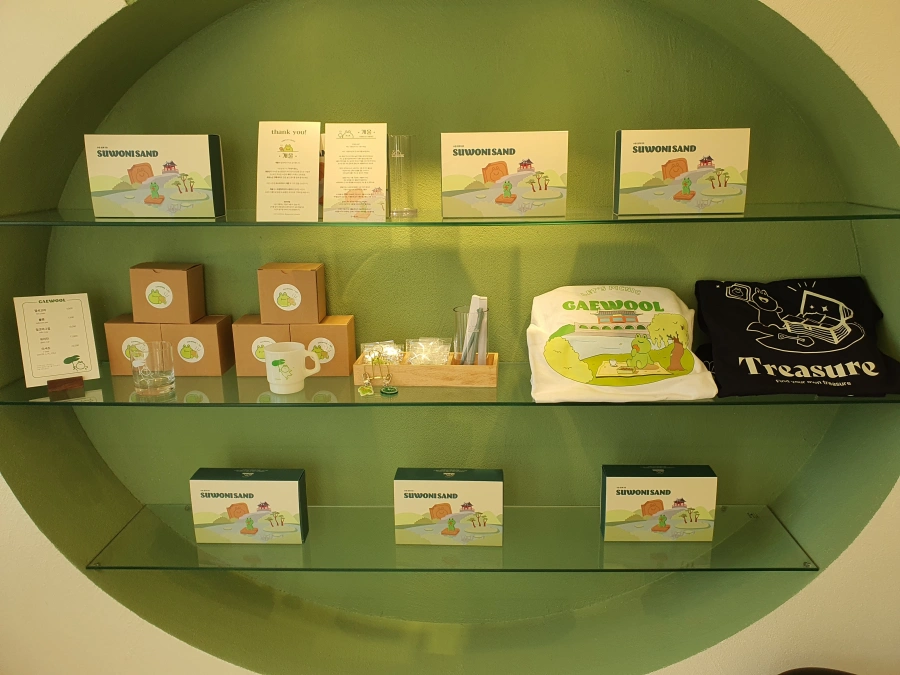 카페 한켠에는 수원청개구리 수원이로 만든 굿즈가 보인다.