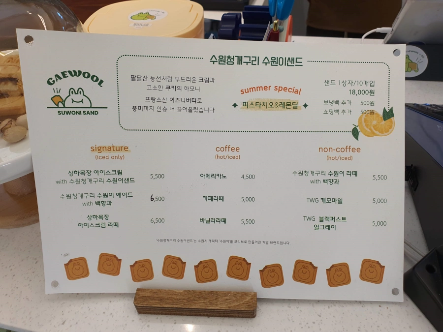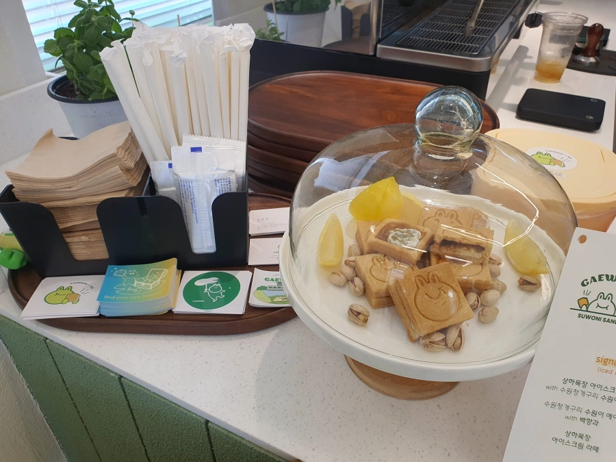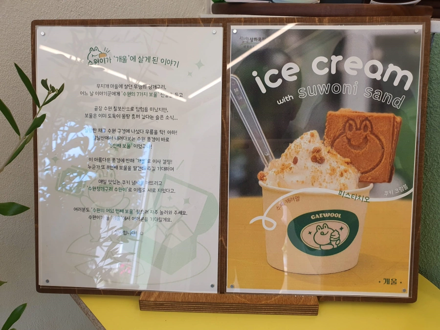 카운터 옆에는 캐릭터 '수원청개구리 수원이'를 만든 스토리와 아이스크림 샘플 사진이 있다.
