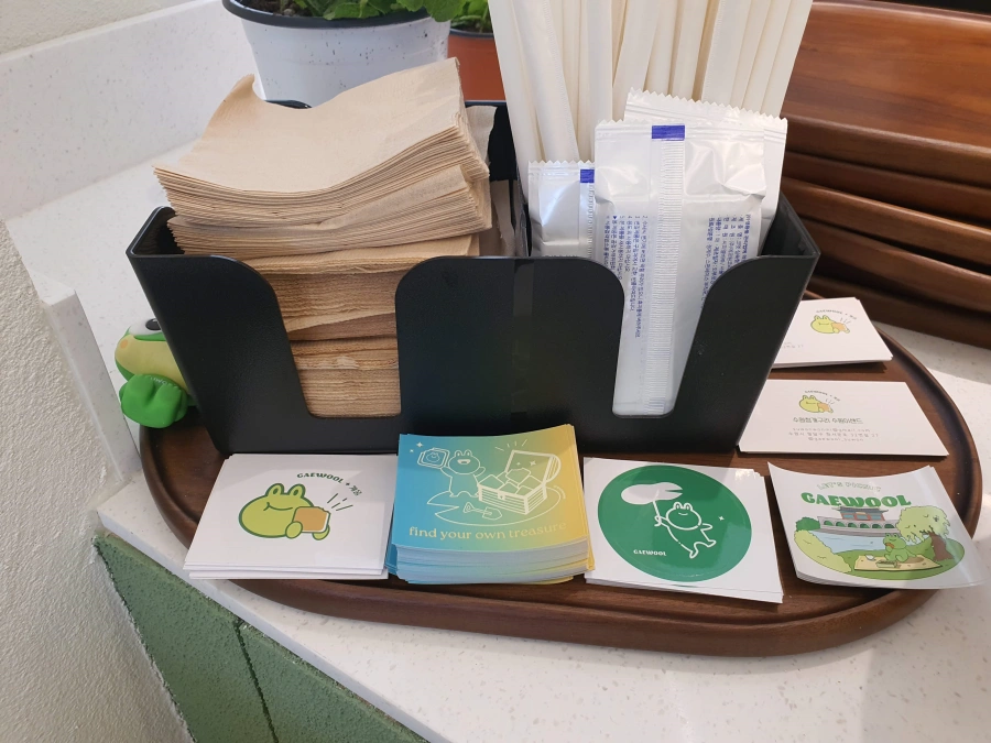 샌드 샘플하고 옆에 티슈하고 빨대 있는 쪽에는 스티커가 있는데 이건 가져가도 된다고 하더라.